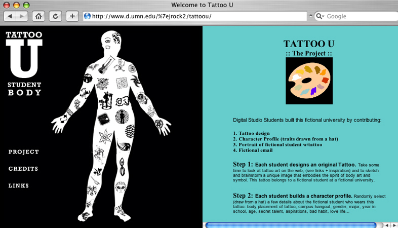 Tattoo U Project collaborative fiction project website development + design by Joellyn Rock contributions from UMD Digital Studio students