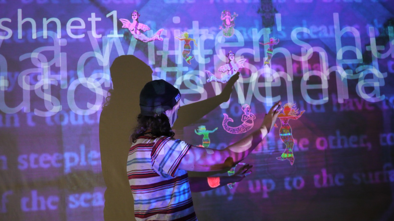 Research into historical topics and current events in Greece, The Mysteries Project plays with the boundaries between fact and fiction, artifice and authenticity. The transmedia mockumentary employs the shifting vernacular of digital formats: the dvd bonus disk, the youtube video, the confessional blog. The story is told through fragments: location photos, production stills, design sketches, storyboards, and video clips. Graffiti Angel in Sophronia is a collaborative work showcased at the Walker Art Center as part of Northern Spark 2014. The participatory work provided opportunity for interaction, encouraging visitors to move their bodies, to make playful silhouettes, to add to the story text via social media on mobile devices. Inspired by historical mermaid legends and their myriad literary variants, Fishnetstockings also encourages both physical and writerly participation, offering ways to play via twitter and kinect. Both of these recent interactive installation projects move storytelling work onto a larger canvas, employing new tools and techniques and collaborative partnerships.
